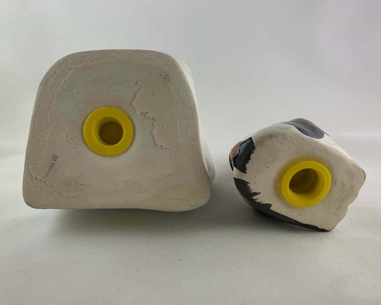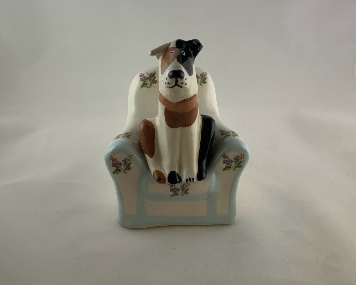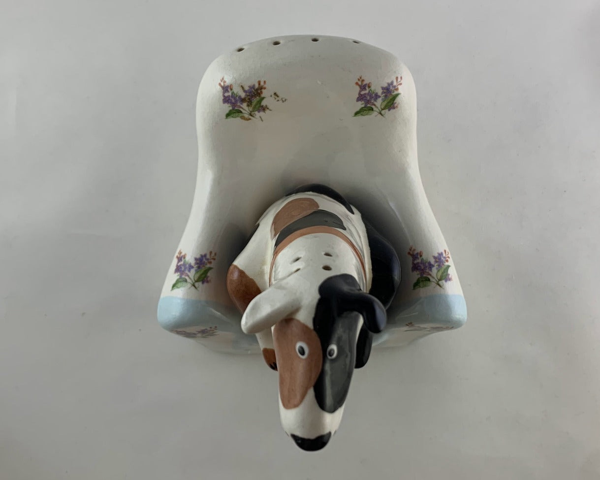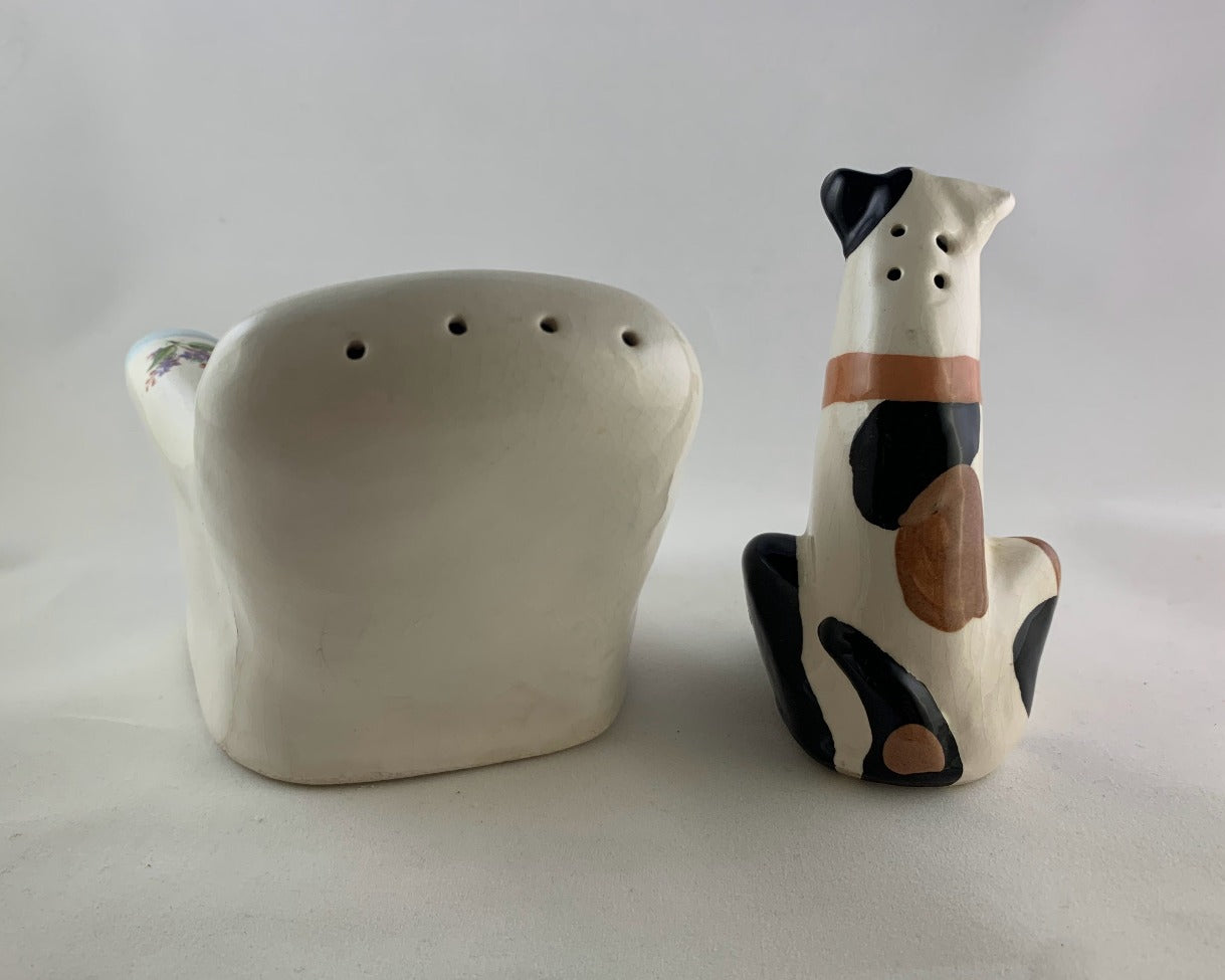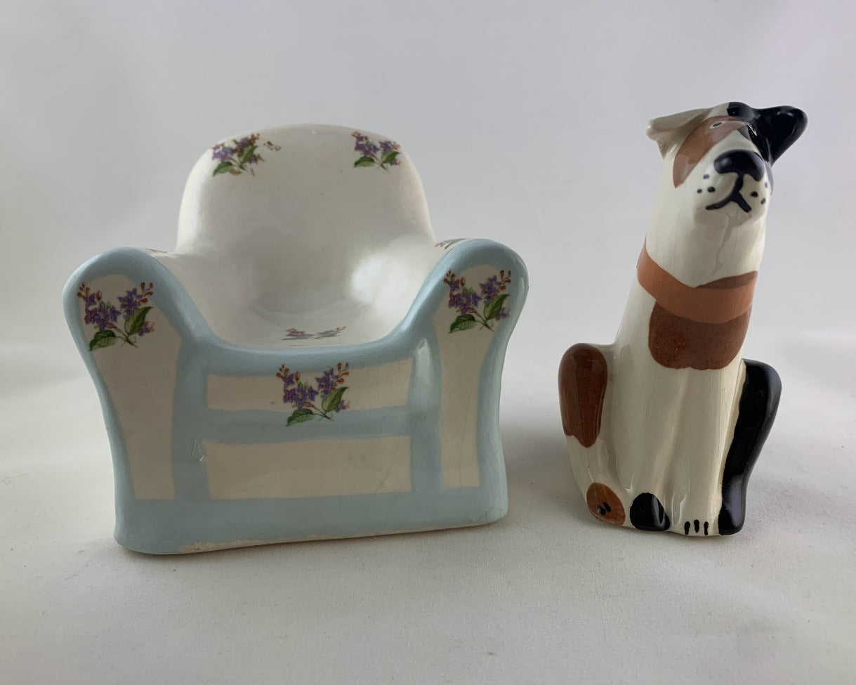 Adorable dog sitting on a large floral armchair salt and pepper shakers. The dog is approximately 2.5 in by 2 in by 3.75 in. The chair is approximately 3 in by 4 in by 4 in.